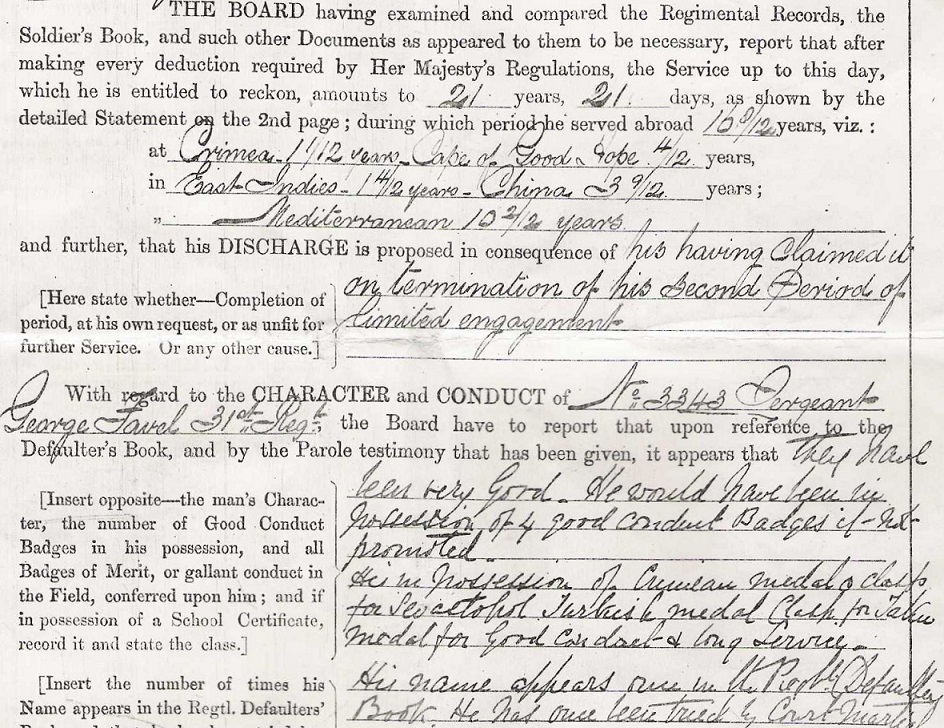 George was born in Hemingford Grey in 1832. His Father was John Favell and his younger brother Stephen was my Great x3 Grandfather. The census taken in 1841 lists him at the age of nine years, living with his parents and five brothers and sisters in the High Street, Hemingford Grey. By the time of the next census in 1851 his Father had died and George had moved out of the family home and along with an older brother William, was lodging with his maternal Grandmother and an Aunt. His widowed Mother was left with a further eight children still living at home, ranging in age between two and twenty years old. George and William were both employed as agricultural Labourers, as were a further two brothers, Thomas (aged 20) and Stephen (age 16) who were still living at home. A younger sister Sarah (age 15) was working as a Servant, while the remaining five children were all of school age or younger. George and the other children that were working probably all had to contribute to help feed and clothe the younger members of the family, and the elder children moving out into lodgings was probably a practical arrangement simply for reasons of space. Little wonder then that the smartly dressed recruiting Sergeant and his party were able to entice the young George to accept the Kings Shilling with the promise of a smart uniform, food, clothing, travel and an opportunity to escape from the hardships of life in a small farming village. He enlisted in the 31st Foot at Hemingford Abbots on the 13th February 1852 at the age of 17 years and 10 months.