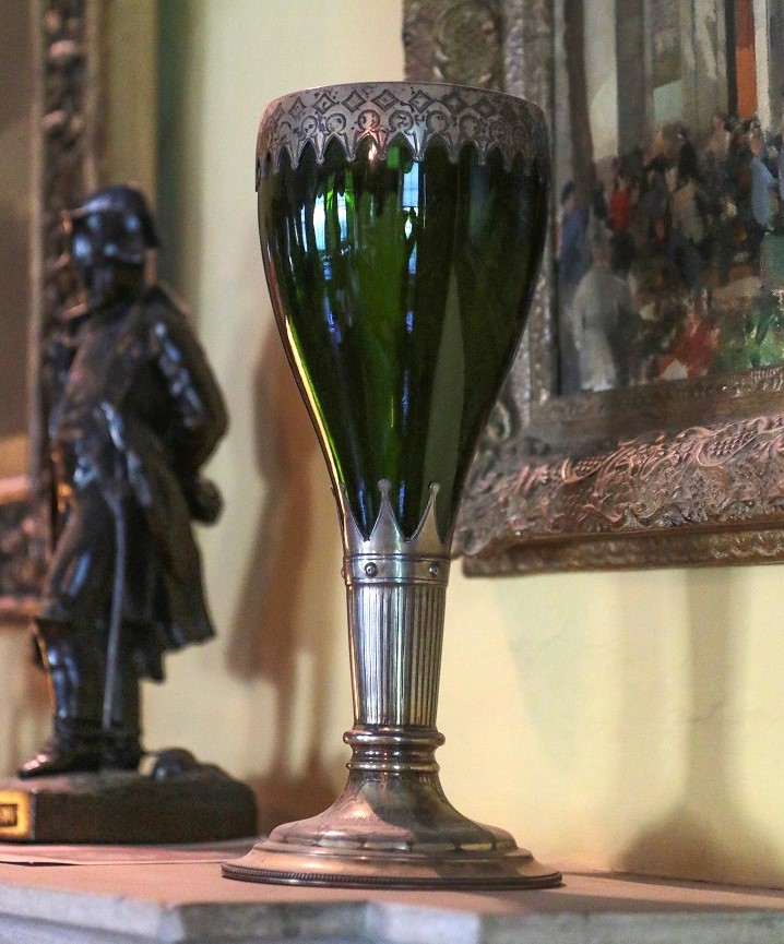 The commemorative glass and silver beaker on the right was manufactured by Rupert Favell of Sheffield and is today on display at Greys Court, a National Trust property near Henley-on-Thames.