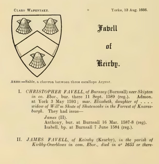In 1666 the Herald’s visitation to Yorkshire recorded the Favell family and its’ coat of arms, a chevron between three escallops, tracing back to Christopher Favell who was buried in Burnsall, near Skipton in Yorkshire in 1589. Christophers’ descendant included a Steward to Algernon, Earle of Northumberland and seems to be the origin of the Sheffield area Favells who later became Doctors, Surgeons, Silversmiths and Wine merchants.